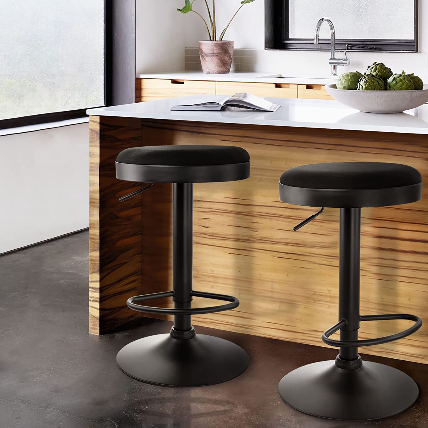 2 Piece Backless Adjustable Fabric Bar Stool in Black with Black Base