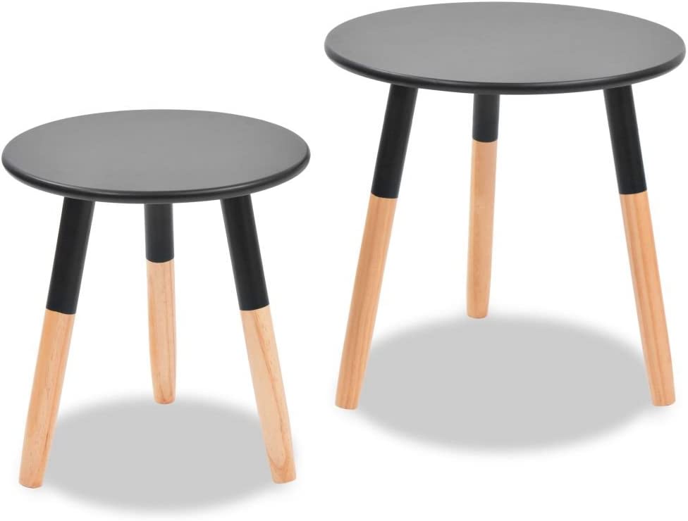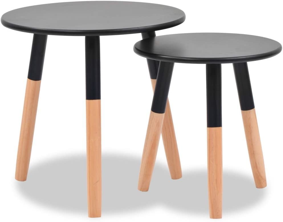 • Color: Black, Material: Solid pinewood legs + MDF tabletop, Larger table dimensions: 18.9" x 18.7" (Diameter x H), Smaller table dimensions: 15" x 15.7" (Diameter x H)
